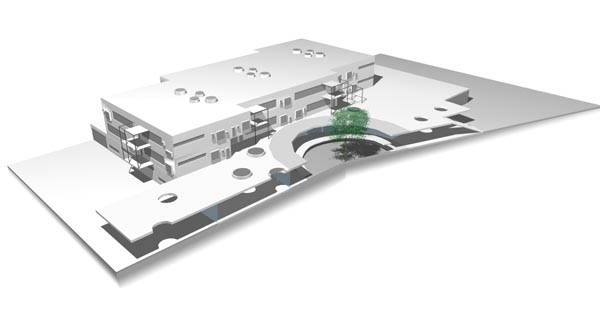 Der Entwurf legt das Augenmerk auf eine Orientierung von Innen nach Außen, er transformiert sich über runde Formen von Innen, zu einem kantigen, städtebaulichen Rand Außen.