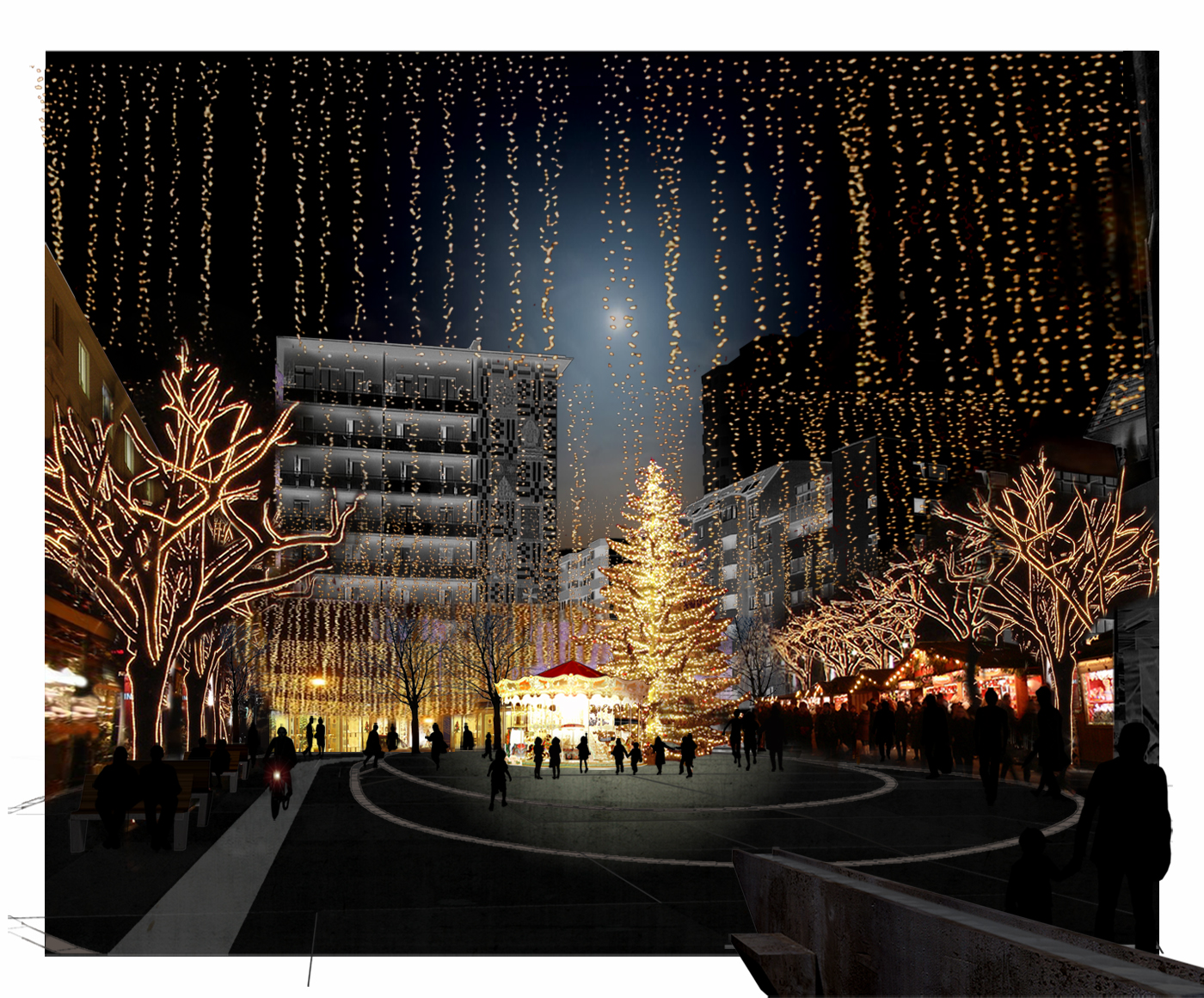 Im Winter sind Nutzungen von Adventmarkt bis Eislaufplatz, der dem sommerlichen Wasser-becken entsprechen kann, möglich.
