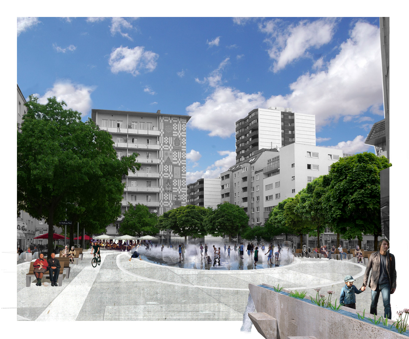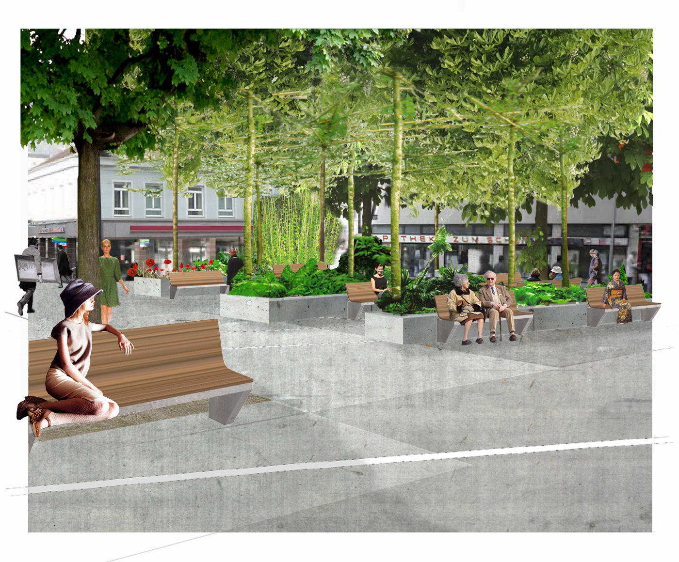 Entlang dieser “Wasserlinie” reihen sich mehrere kleinere Plätze: Die Eigenheiten dieser Plätze werden durch unterschiedliche Pflanzungen und Erkennungsmerkmale verstärkt und der Wiedererkennungswert und somit die Identifikation gesteigert.
