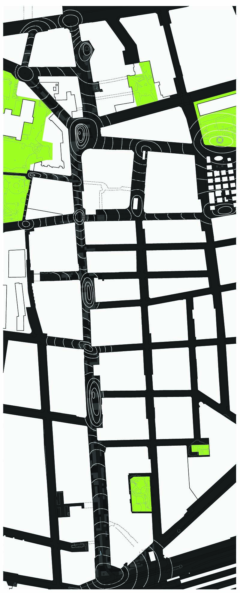 Das gesamte Entwurfsgebiet wird mit einem Netz aus Linien strukturiert, es legt sich, einem Magnetfeld ähnlich über die Gassen und schafft den Zusammenhalt der einzelnen sehr unterschiedlich gestalteten Bereiche. Diese Linien reagieren auf Zentren, Einmündungen, Punkte mit erhöhter Frequenz, Gefahrenzonen mit Verkehr etc. Sie betonen Verbindungen und folgen Bewegungsströmen.