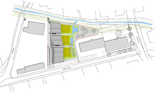Das Gebäude rückt unter Rücksichtnahme auf eine spätere Bebauung im Norden von der Grundstückgrenze ab, um eine sanfte Rampe in die Tiefgarage frei zu spielen und den umgebenden Freiraum nicht als Schlucht erfahrbar zu machen.