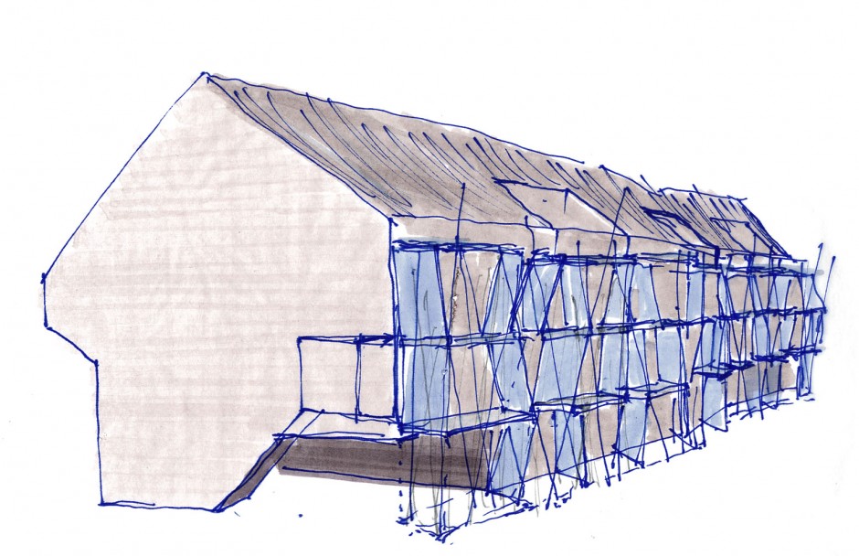 Als Ausgangspunkt für den Entwurf spielen die alten auf dem Gelände stehenden Gebäude des Holzverarbeitungsbetriebes eine entscheidende Rolle. Das Material der alten Hallen aus Holz spiegelt sich in der Oberfläche des Entwurfs – als Holzfassade wider. Im Zuge der ersten Untersuchungen des Raumprogramms und der „städtebaulichen“ Möglichkeiten erschien sehr bald die Vorstellung ideal, das traditionelle Satteldach und eine Deckung mit Holzschindeln neu zu interpretieren und zu kombinieren.
