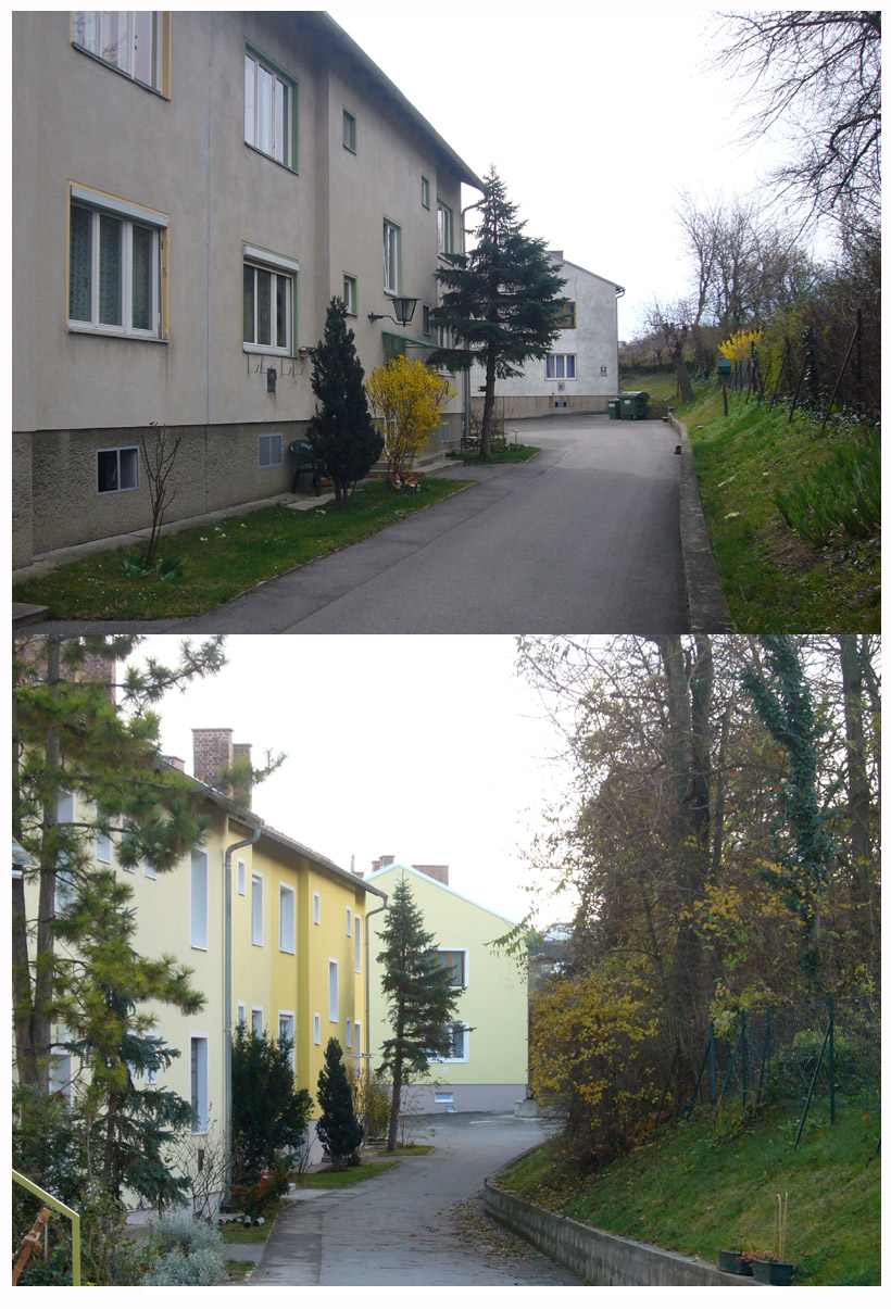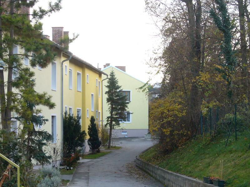 Die Fassade einer Wohnhausanlage mit 8 Häusern und 105 Wohnungen in Mödling, NÖ ist nach 50 Jahren unansehlich geworden und hatte zum Teil schon erhebliche Schäden durch diverse Umwelteinflüsse. Es wurde daher gemeinsam mit Vertretern der Eigentümer und der Hausverwaltung  ein Konzept für die Sanierung erstellt, welches die wirtschaftlichen sowie ästhetischen Ansprüche erfüllen sollte. In Zusammenarbeit mit einem Bauphysiker konnte das Kosten Nutzen Verhältnis der thermische Sanierung optimiert werden und somit der Eigentümergemeinschft zur Abstimmung vorgelegt werden. Die größte Schwierigkeit war es 105 unterschiedlichen Zugänge der Wohnungsbesitzer zu Nutzen und Wirkung einer solchen baulichen Massnahme in Einklang zu bringen. Dies gelang.